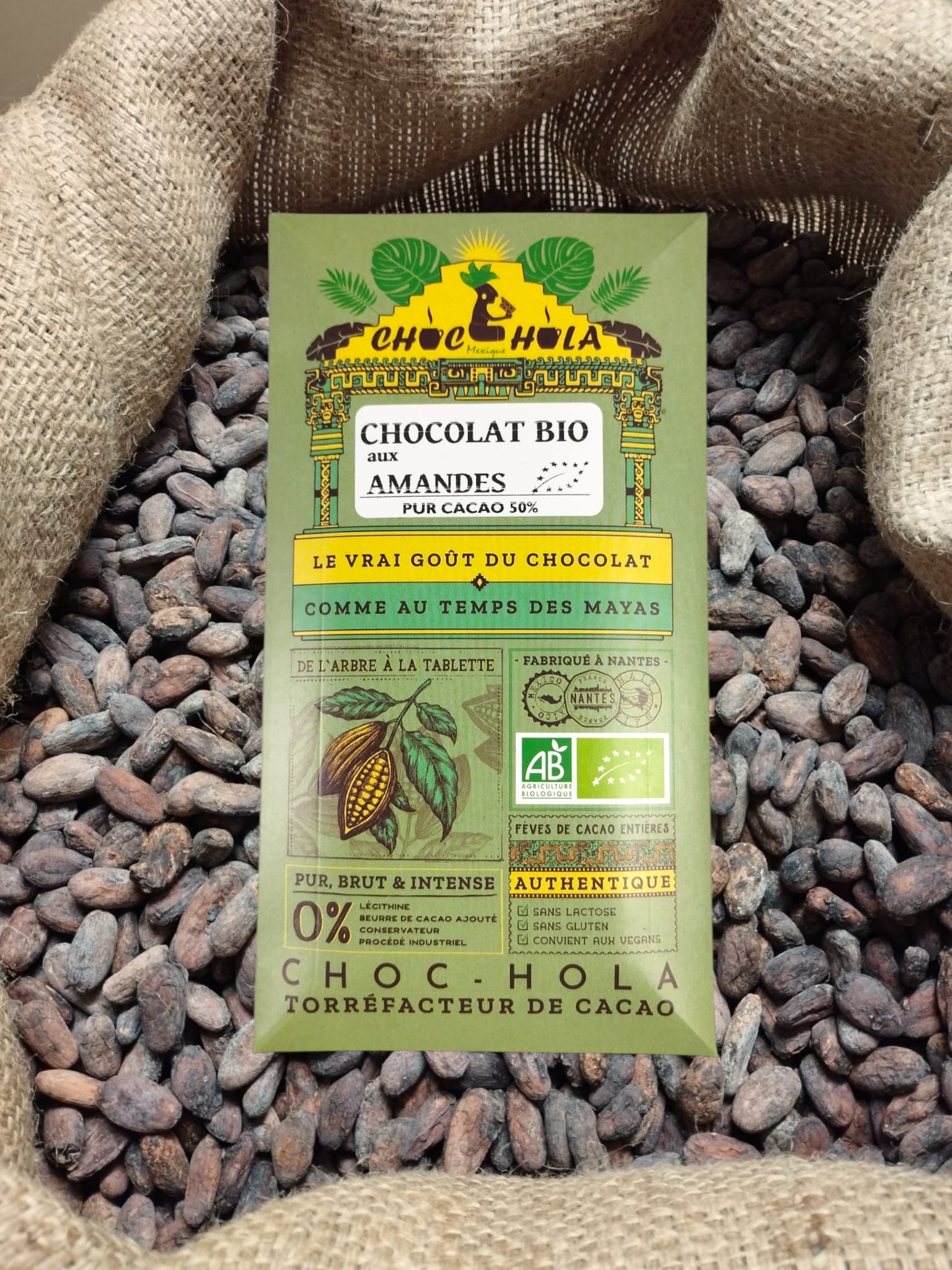 Tablette chocolat noir BIO aux Amandes – Pur Cacao 50% min – 100g