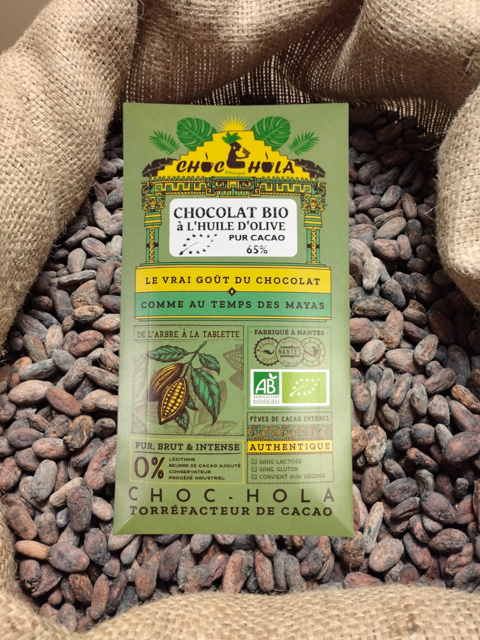 Ingrédients : Fèves de cacao* (65% min), sucre de canne*, huile d’olive*(5%).